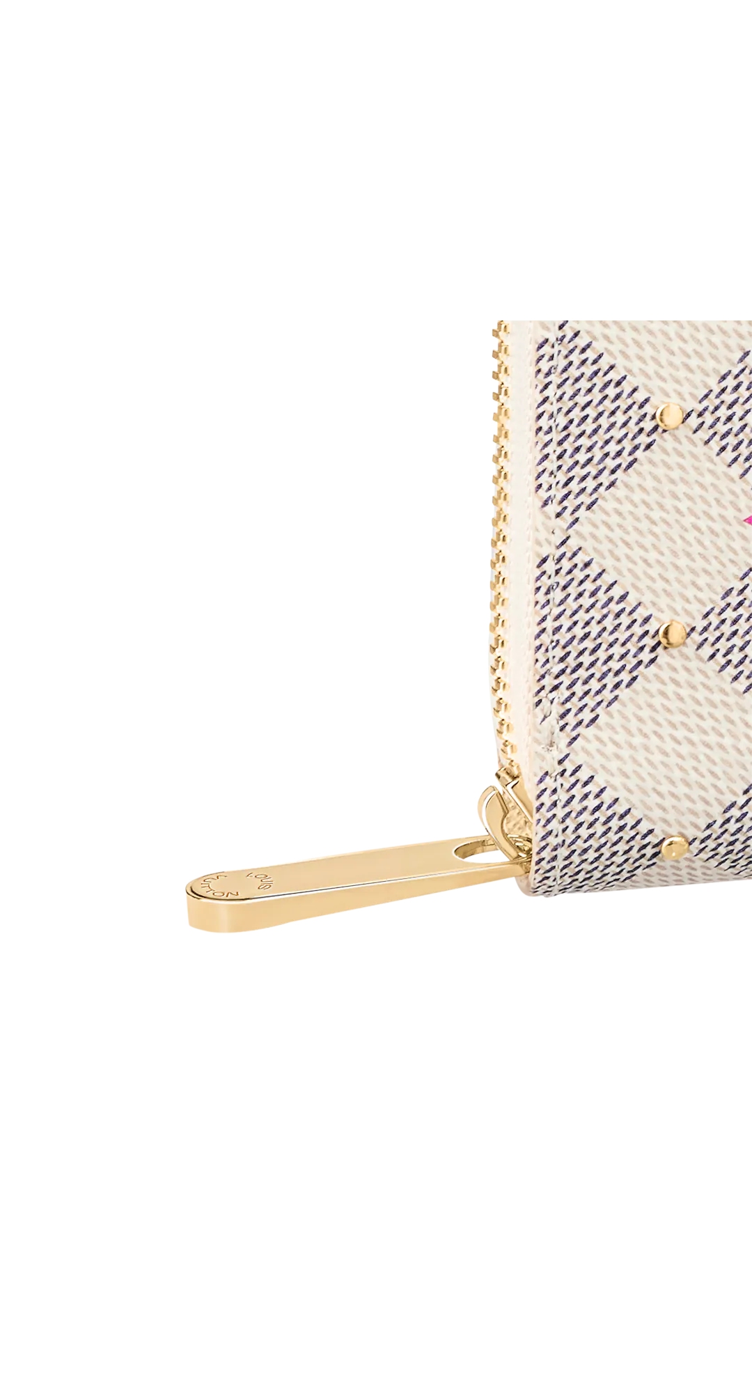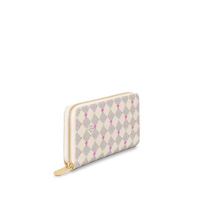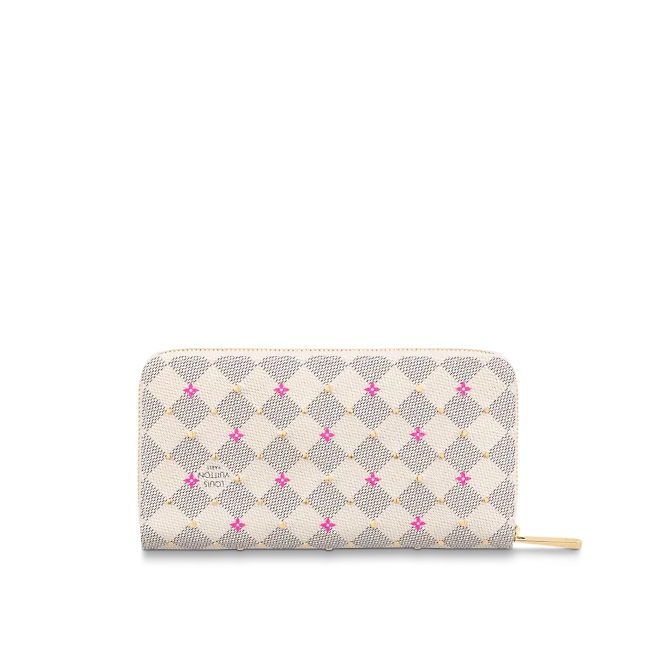 “Zippy Wallet” reinterpreted for the “Damie Azul Studs” collection. Damie Azul canvas with fuchsia pink floral motif print and small gold-coloured studs. The contrasting pink lining that emerges when you open the reassuring round zipper and the interior with multiple compartments, pockets and card slots are also attractive.