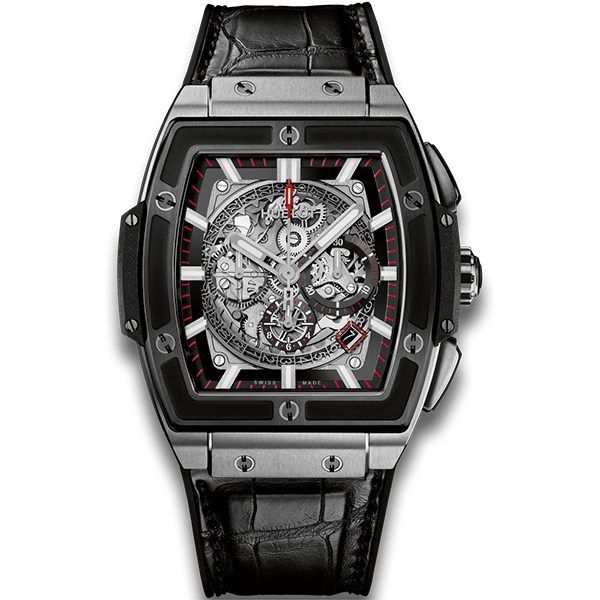 Bezel: Satin-finished, polished, microblasted black ceramic with 6 H-shaped titanium screws